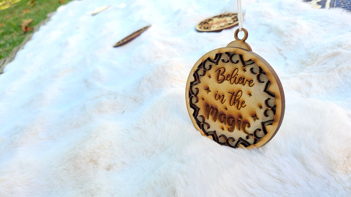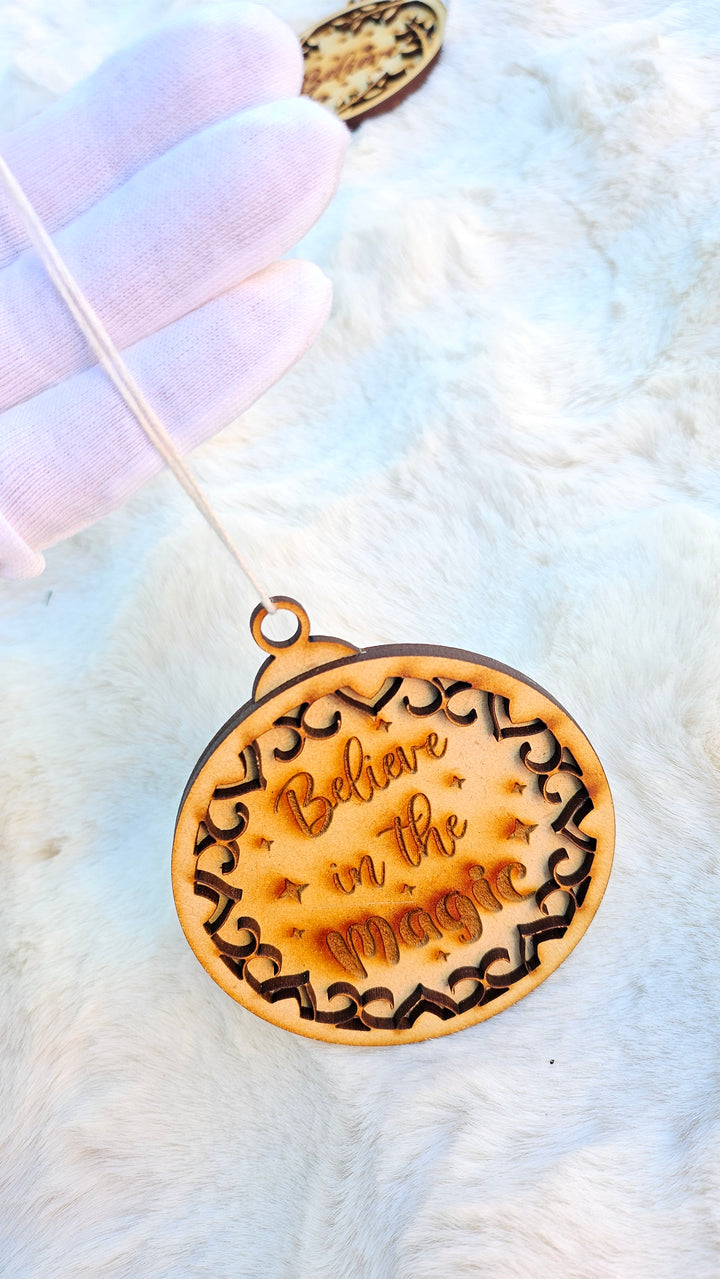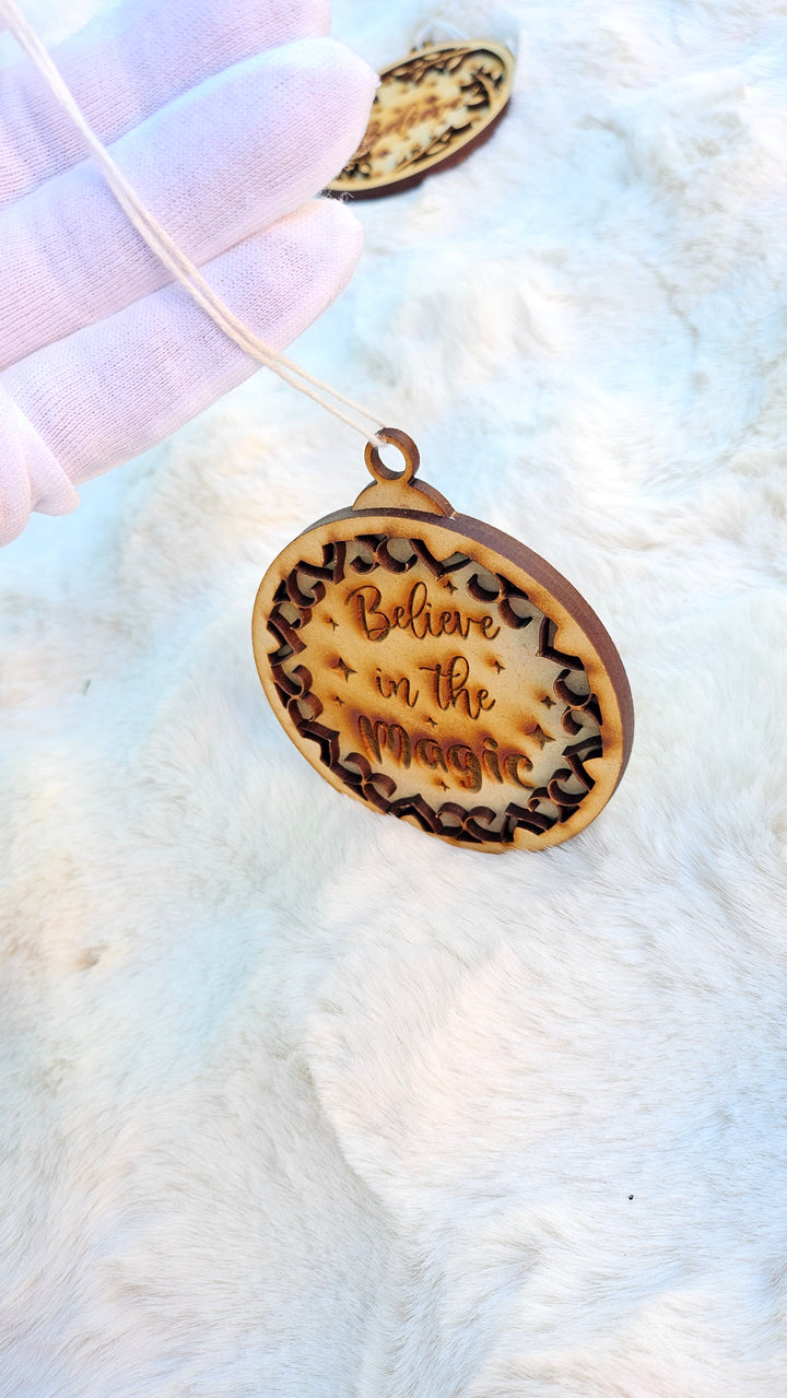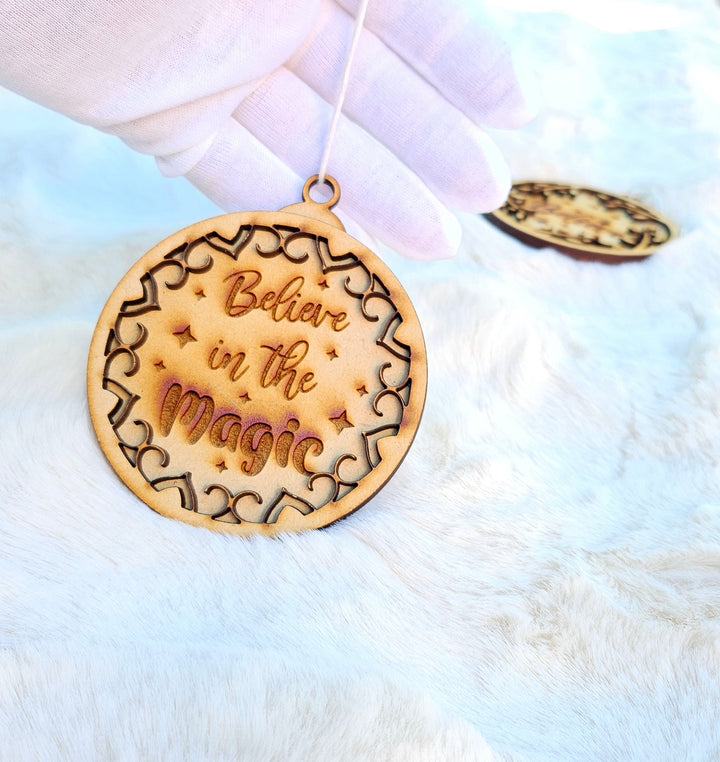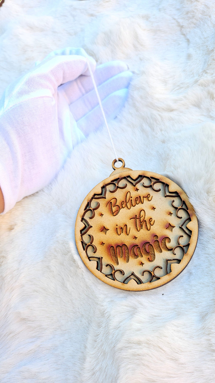 Add a touch of wonder to your holiday décor with our Believe in the Magic wooden ornament — laser-cut with precision and engraved with care to remind everyone of the joy and sparkle of the season. The intricate cut-out design and warm wooden tones create the perfect rustic-chic accent for your Christmas tree or holiday gifts.