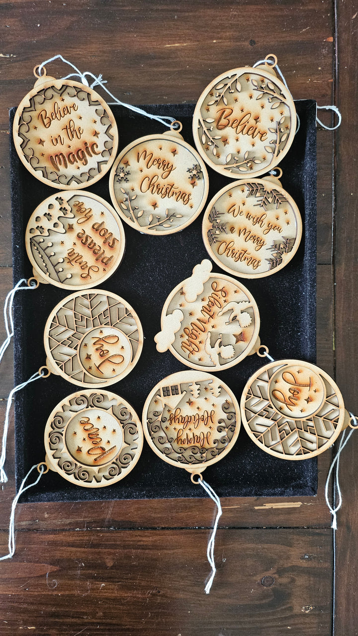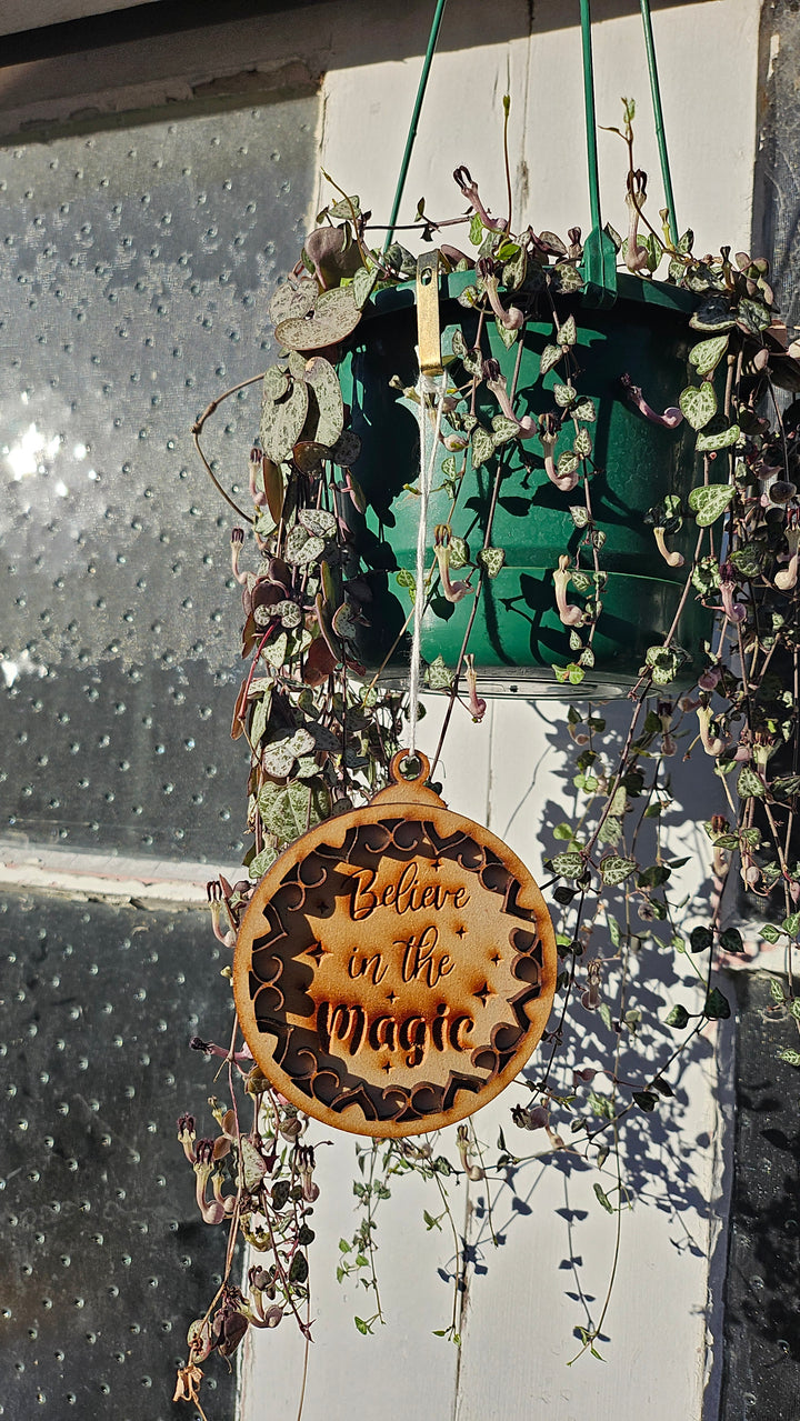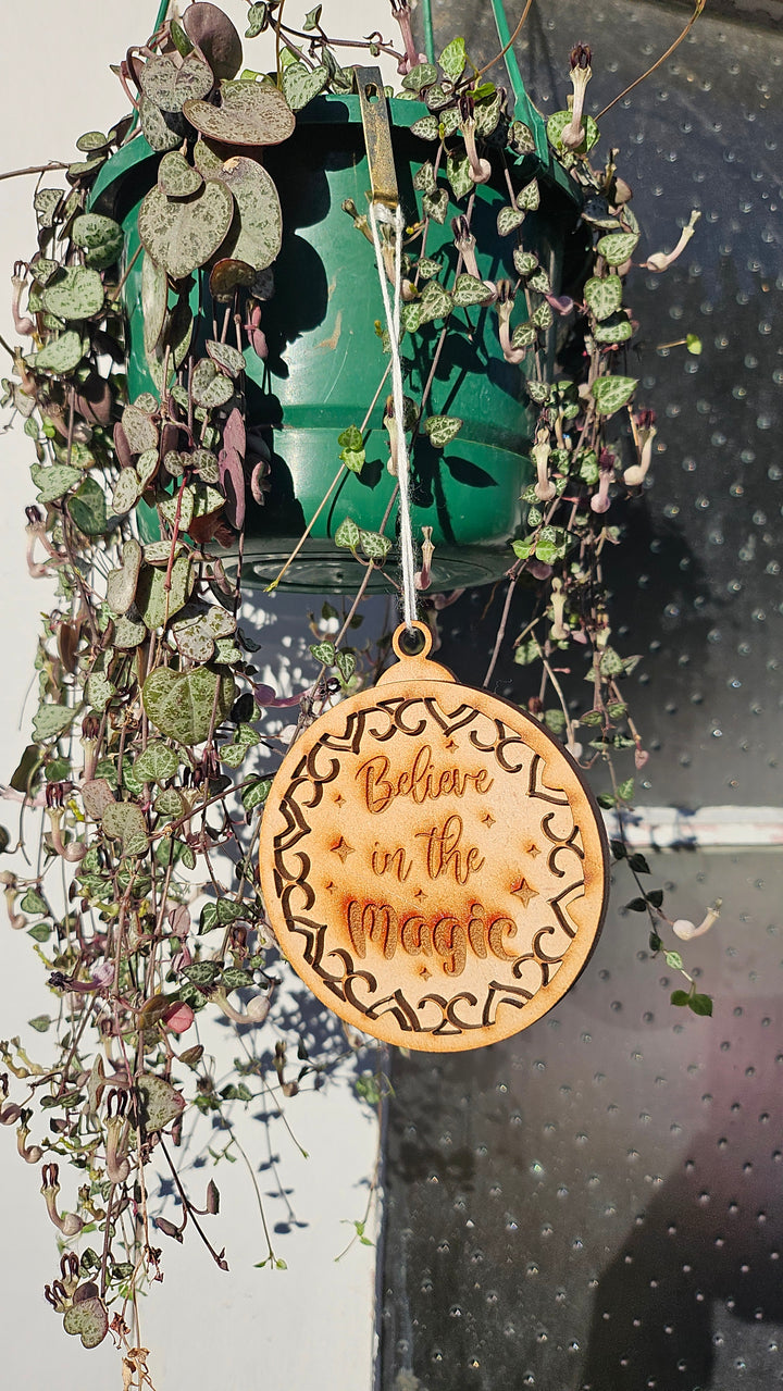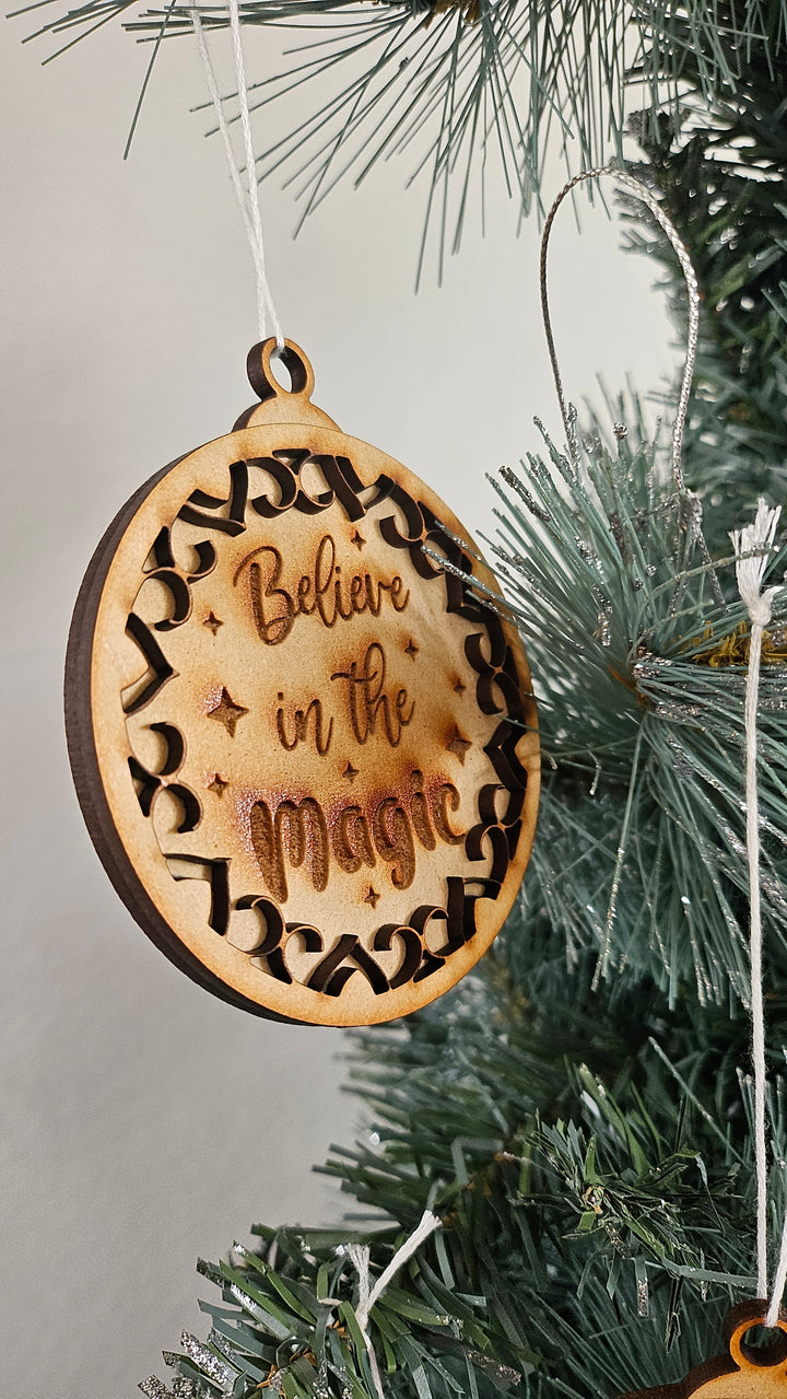 Add a touch of wonder to your holiday décor with our Believe in the Magic wooden ornament — laser-cut with precision and engraved with care to remind everyone of the joy and sparkle of the season. The intricate cut-out design and warm wooden tones create the perfect rustic-chic accent for your Christmas tree or holiday gifts.