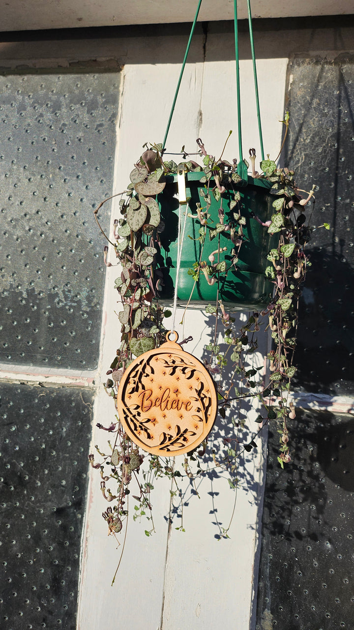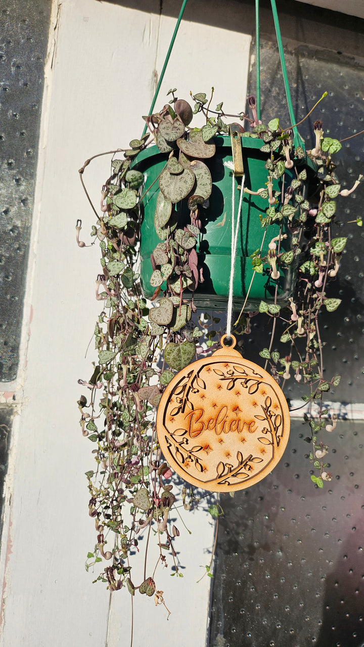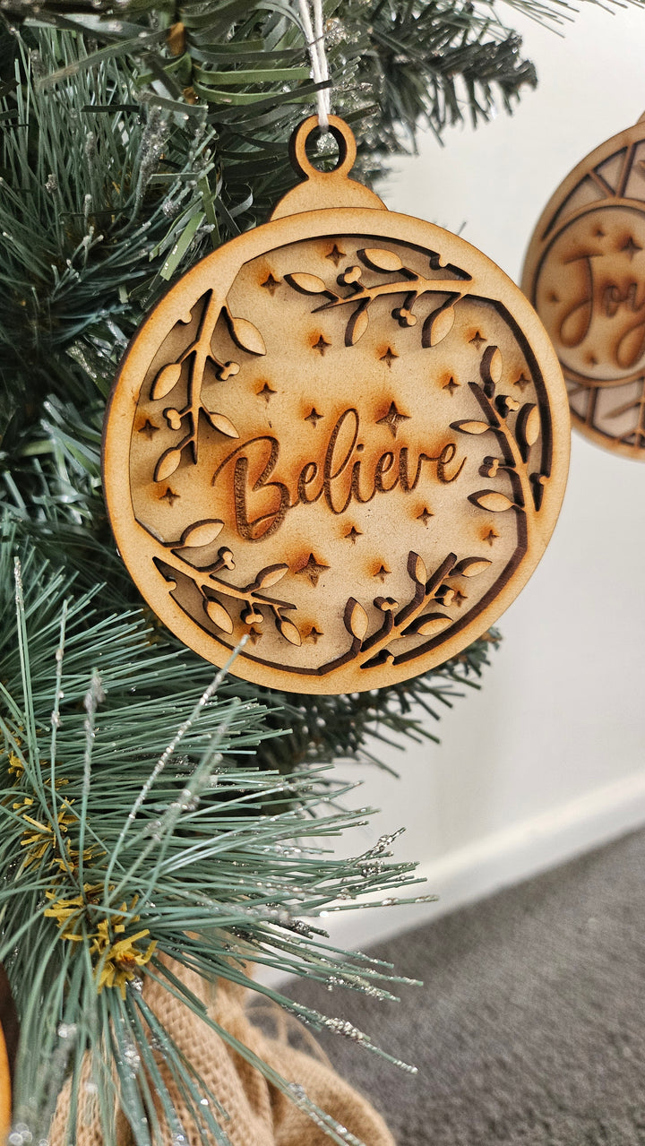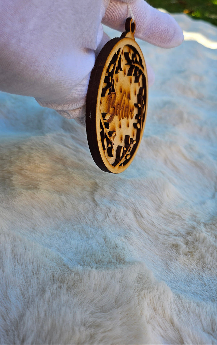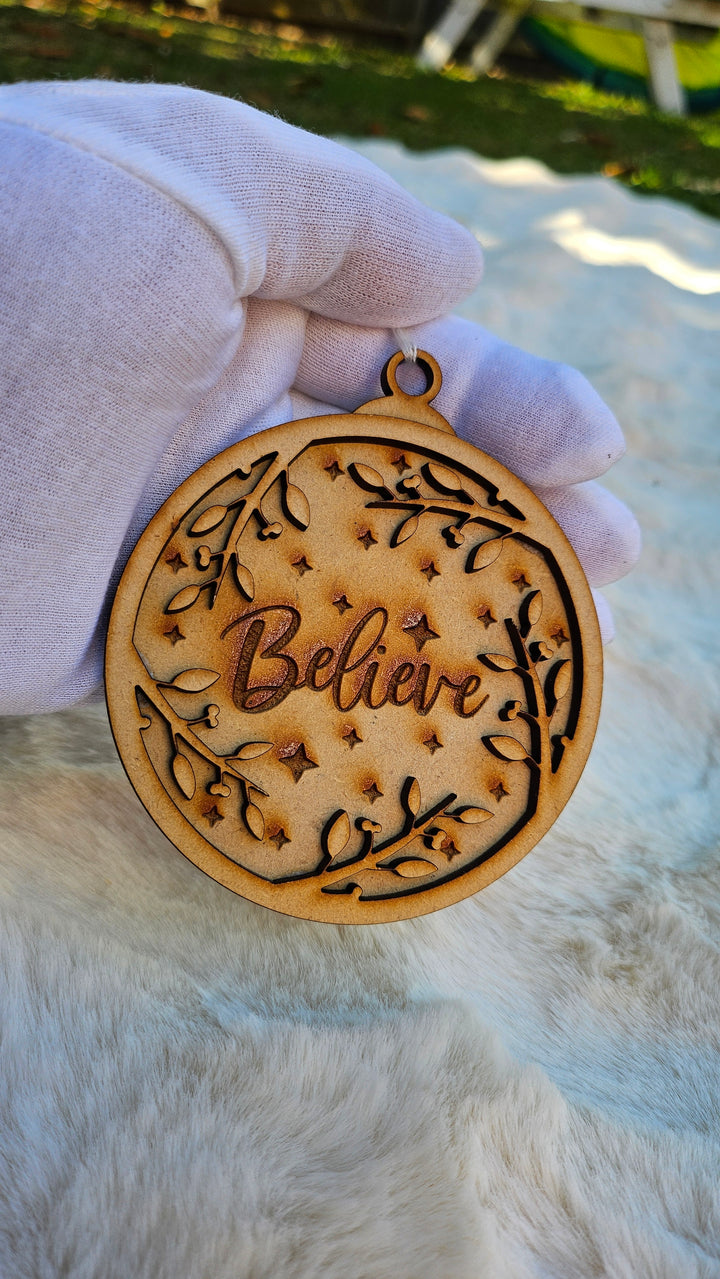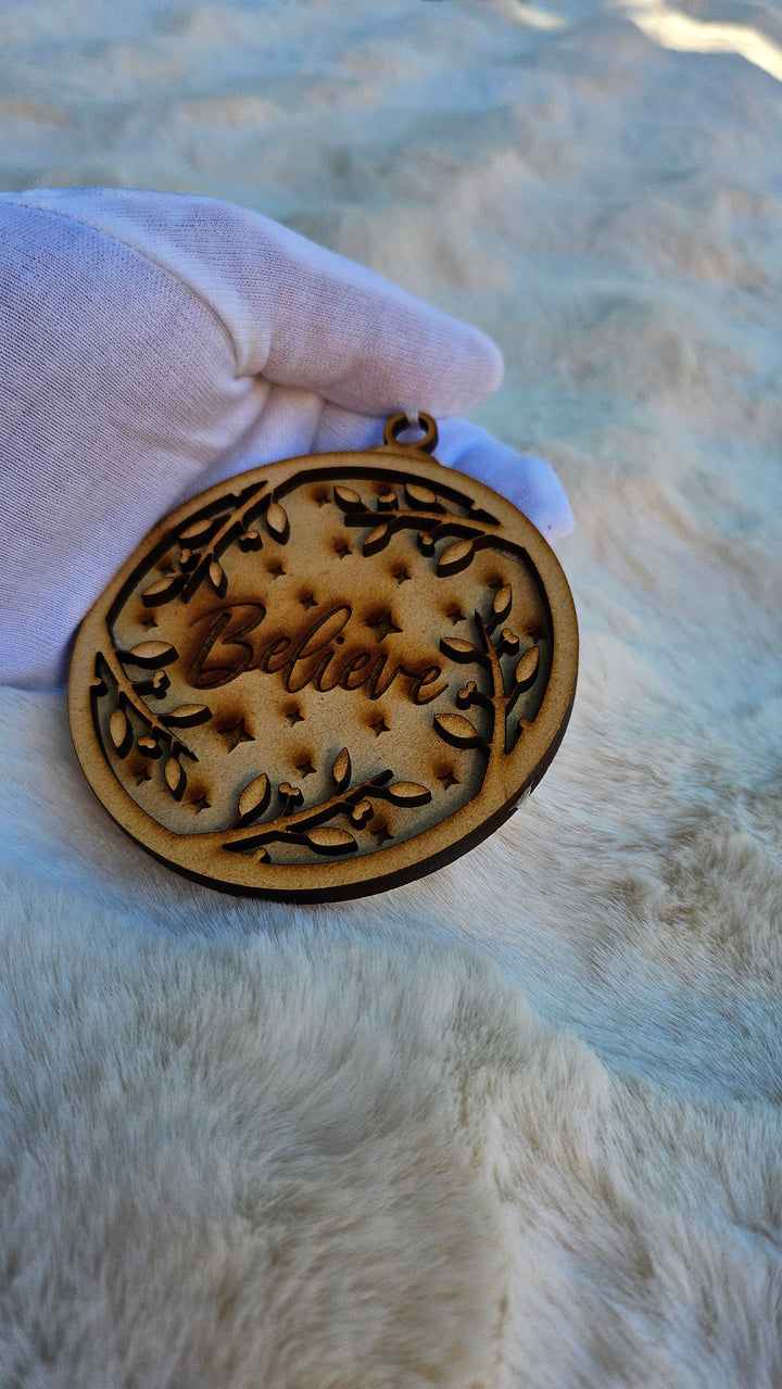 Add a touch of holiday magic to your home with our Believe wooden ornament — laser-cut and engraved with intricate detailing to capture the spirit of Christmas. This elegant design features engraved stars and delicate foliage, symbolizing faith, joy, and the warmth of the festive season. Perfect for decorating your Christmas tree or gifting to loved ones.