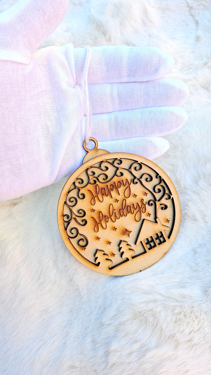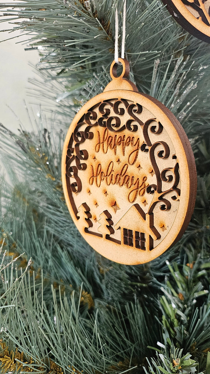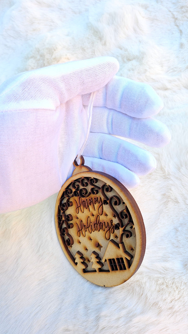 Add warmth and festive elegance to your Christmas décor with our Happy Holidays wooden hanging ornament — laser-cut and engraved with precision for a timeless handcrafted look. Each ornament features intricate detailing of trees, stars, and a cozy holiday home scene, perfect for any Christmas tree or gift wrap.