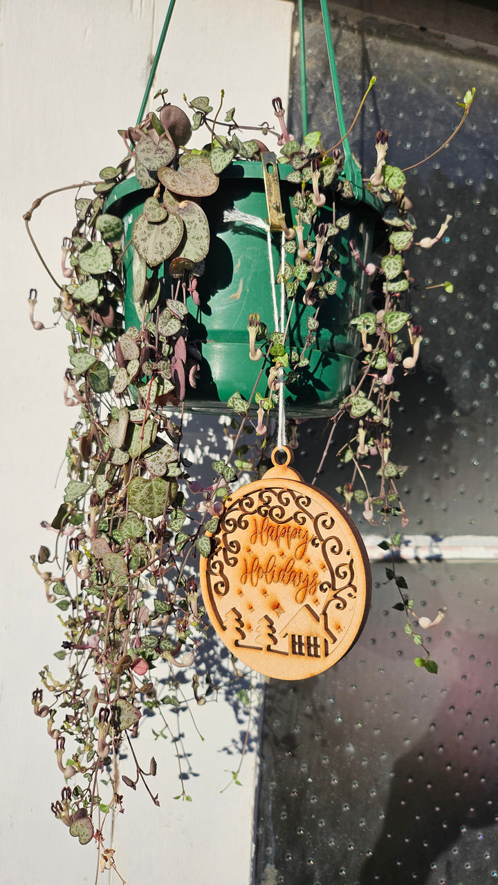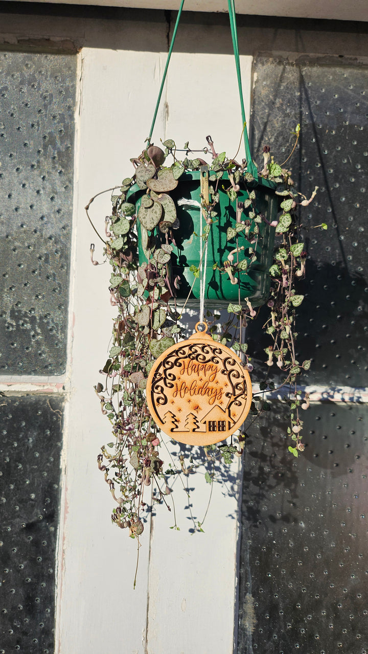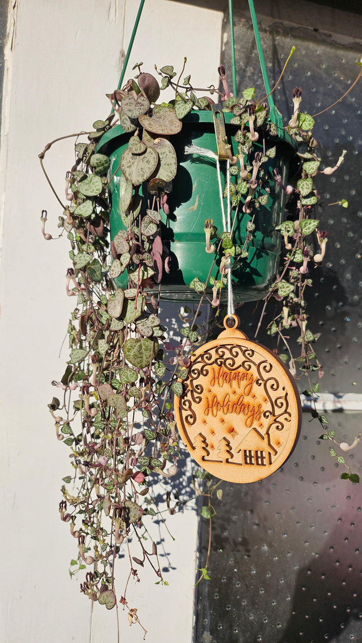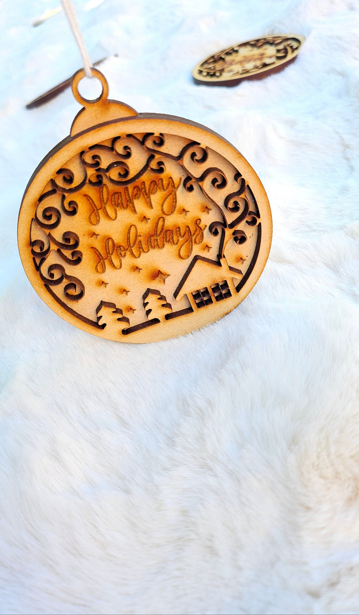 Add warmth and festive elegance to your Christmas décor with our Happy Holidays wooden hanging ornament — laser-cut and engraved with precision for a timeless handcrafted look. Each ornament features intricate detailing of trees, stars, and a cozy holiday home scene, perfect for any Christmas tree or gift wrap.