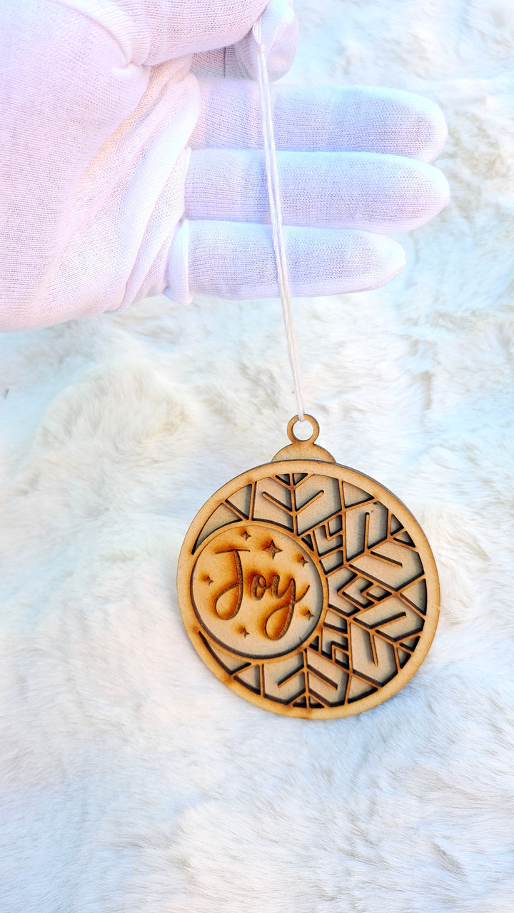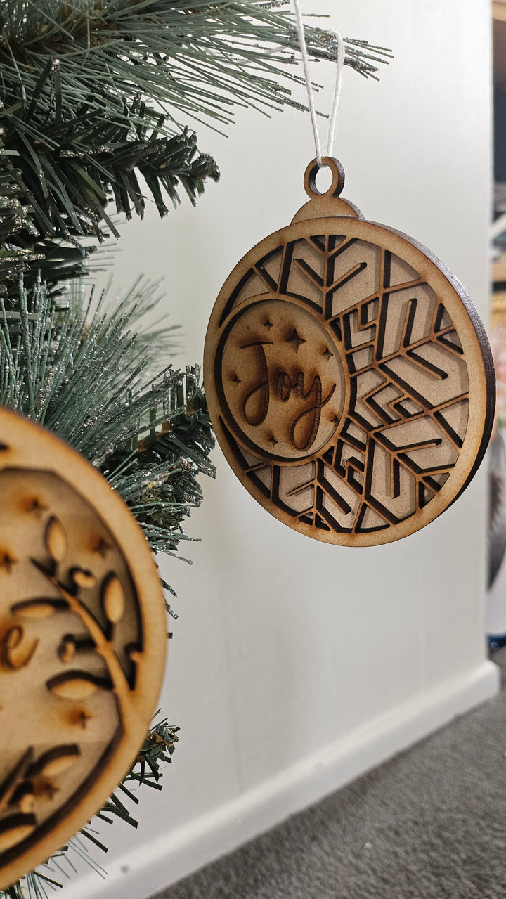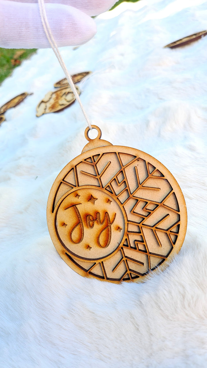 Spread holiday happiness with our Joy wooden ornament — laser-cut and engraved with precision to bring warmth and cheer to your festive décor. Featuring a detailed snowflake-inspired design and beautifully engraved lettering, this ornament perfectly combines rustic charm with elegant craftsmanship.