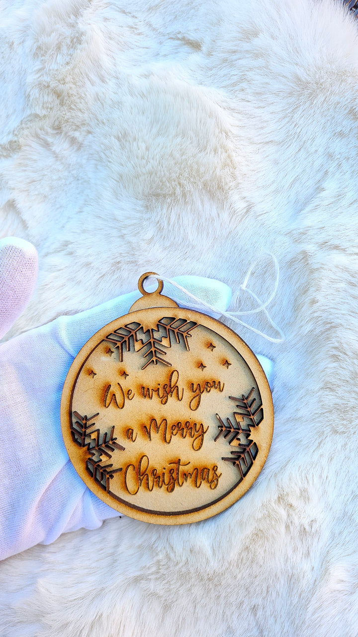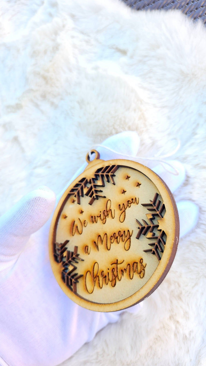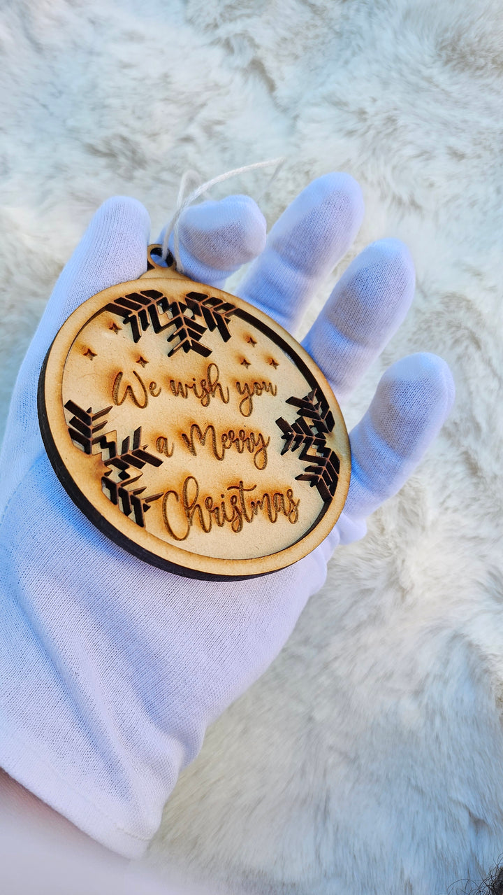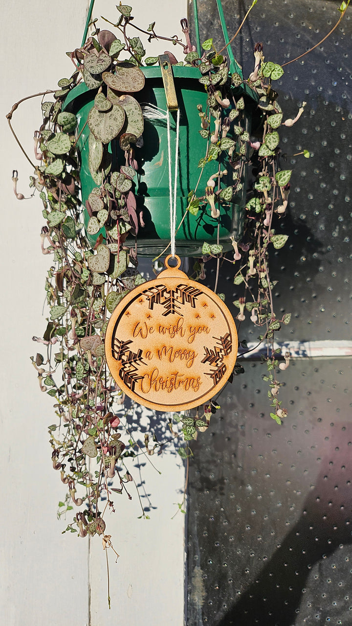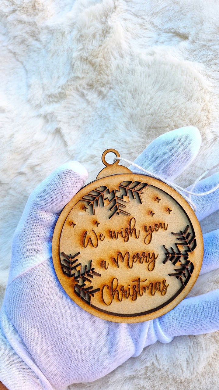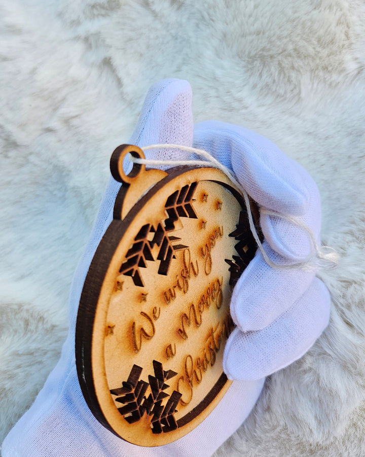 Celebrate the most wonderful time of the year with our We Wish You a Merry Christmas wooden ornament — laser-cut and engraved with precision to capture the spirit of the holidays. This handcrafted decoration features a snowflake-inspired border and elegant engraved lettering, perfect for adding a cozy rustic touch to your Christmas tree.