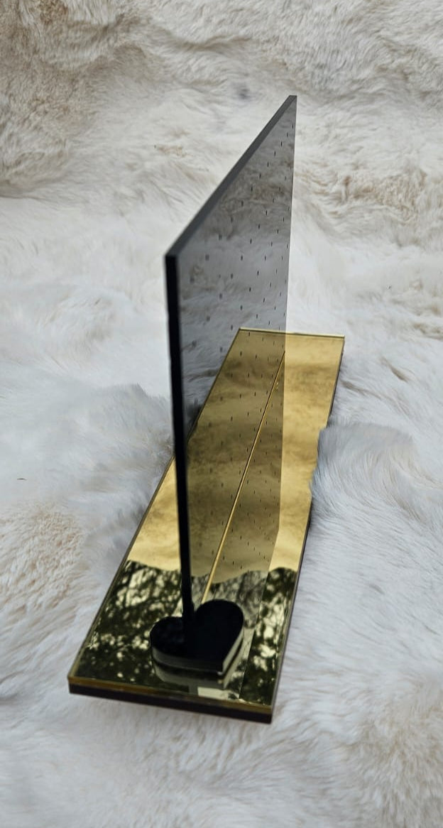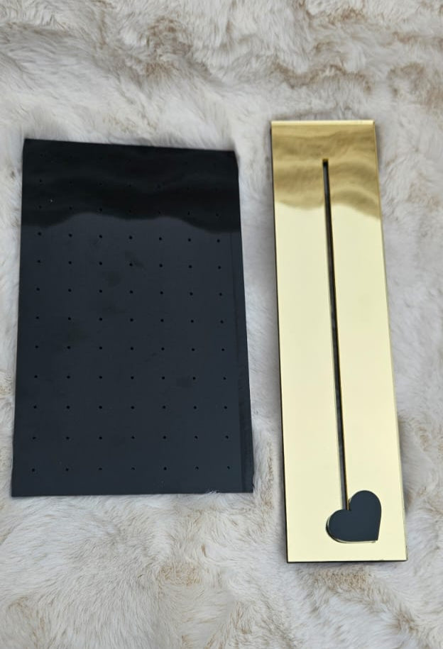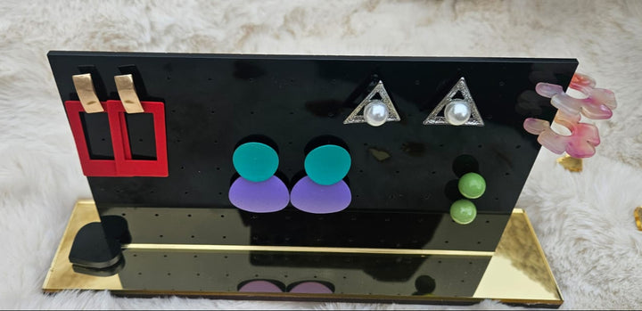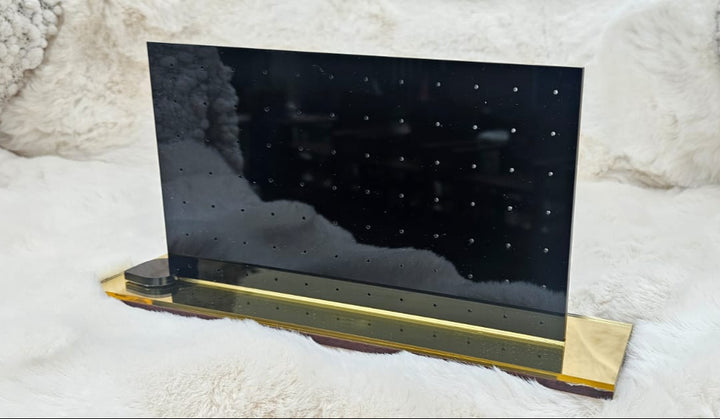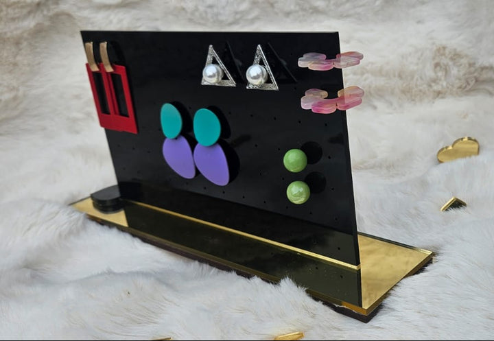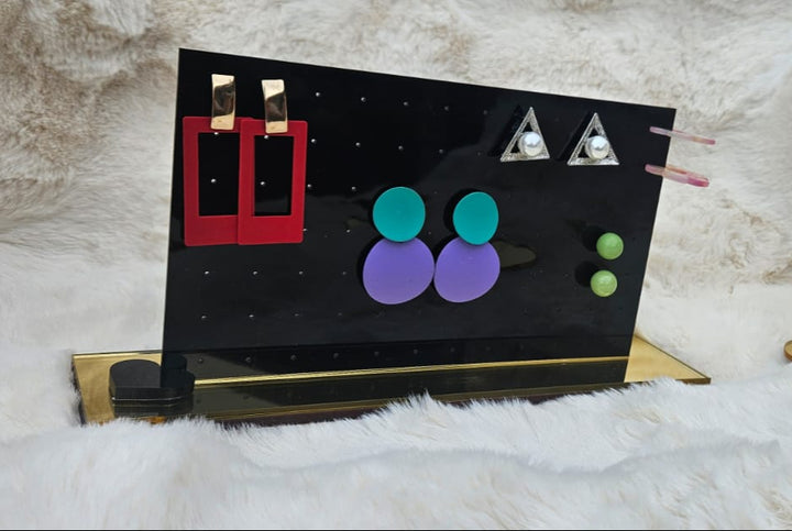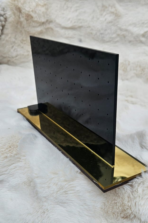 Keep your earring collection neat and glamorous with our Luxury Black Acrylic Stud Earring Display Stand with Gold Base. Crafted from high-grade laser-cut acrylic, this “stud earring organizer” features a sleek, modern rectangular panel in gloss black mounted on a reflective gold acrylic base. With 40+ micro-drilled holes for studs and small earrings, it’s the perfect blend of function and high-end aesthetics—ideal for personal vanities, retail counters, boutique displays, or gifting.